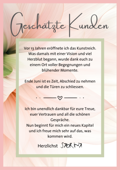 Nun beginnt für mich ein neues Kapitel und es ist Zeit Abschied zu nehmen. Wir schliessen das Kunstreich Ende Juni 2026.